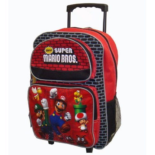 Show off your Nintendo pride with favorite game characters from the Super Mario Series. This rolling backpack is a full size that measures 15.5in x 12in and Features game level pattern of bricks in black and red, 2 front zipper pouches, One side mesh pocket, One side velcro pocket and Retractable handle for rolling the backpack. Officially Licensed Rolling Backpack by Nintendo. Manufactured by Fast Forward LLC.