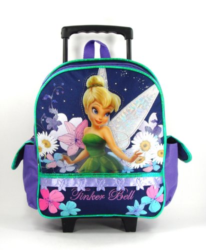 Kids size Tinkerbell toddler Rolling Backpack from KaracterKlub (perfect size for the kids between 3 - 5 years old) Measures approx. 12"H x 9"W x 5"D telescope handle that raises 9" from the top, easy to maneuver includes: side pockets for convenient organization, and one big zipper pocket in the front, smooth rolling luggage style wheels. adjustable durable padded shoulder straps that tucks away, easy to clean and maintain.
