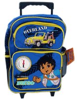 Go Diego Go Large Rolling Backpack Kids size Large Rolling Backpack Measures approx. 15"H x 12"W x 5"D telescope handle that raises 13" from the top, easy to maneuver includes: mesh pocket for water bottle, side pockets for convenient organization, and one big zipper pocket in the fro ...
